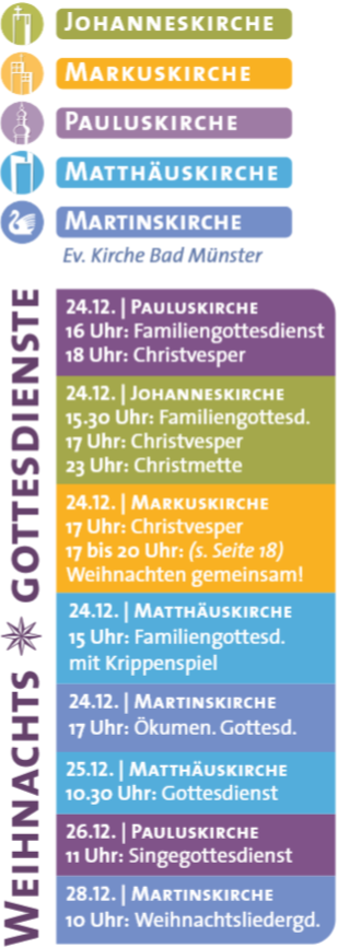 14.12.2025- ab 9 Uhr: Weihnachtsbaum- verkauf an der Matthäuskirche - und um 10.30h Gottesdienst ´Kirche mit Kindern´19.12.25 - 19.00 h - Martinskirche Bad Münster - Jugendgottesdienst----------------------------------- Weihnachtsgottesdienste → ----------------------------------- Sa, 31.01.2026 - 10.00 Uhr Gemeindehaus Matthäuskirche - Geschichtshäppchen mit Brunch - mit Claudia Frey |