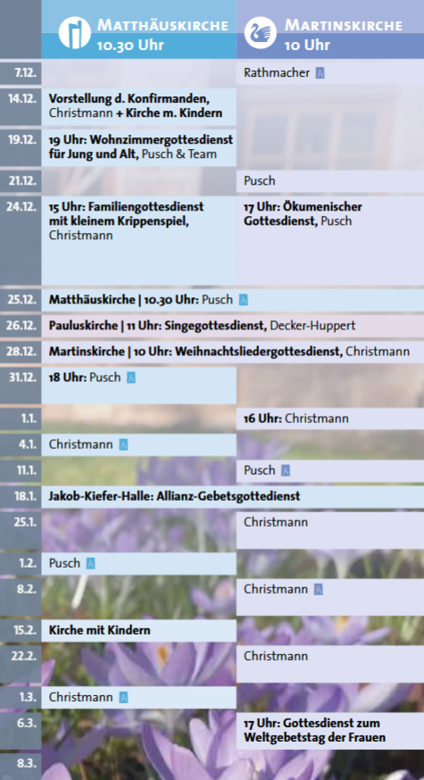 14.12.2025- ab 9 Uhr: Weihnachtsbaum- verkauf an der Matthäuskirche - und um 10.30h Gottesdienst ´Kirche mit Kindern´19.12.25 - 19.00 h - Martinskirche Bad Münster - Jugendgottesdienst----------------------------------- Weihnachtsgottesdienste → ----------------------------------- Sa, 31.01.2026 - 10.00 Uhr Gemeindehaus Matthäuskirche - Geschichtshäppchen mit Brunch - mit Claudia Frey |